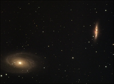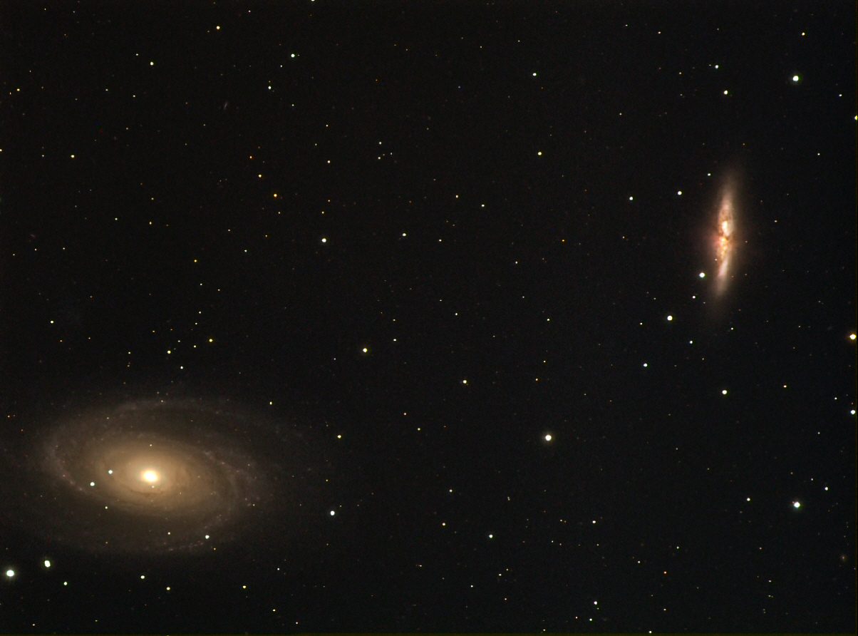 Die Entfernung beträgt 12 Mio Lichtjahre Eine scheinbare Helligkeit von +6,9 mag M81 +9,3 mag M82 Und hat eine Flächenausdehnung von 26,9' × 14,1' u. 11,2' × 4,3' |
