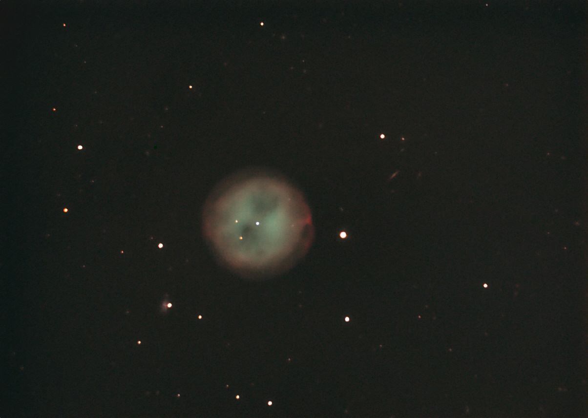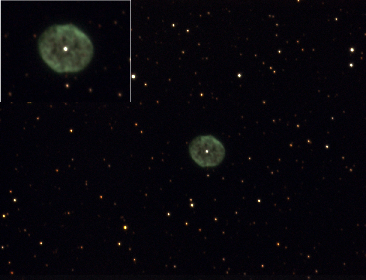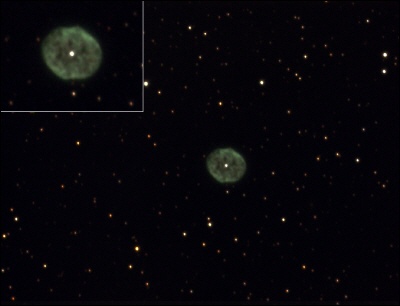 Die Entfernung beträgt 2.600 Lichtjahre heller planetarischer Nebel +9,9 mag Flächenausdehnung von 3,4′ × 3,3′ |
