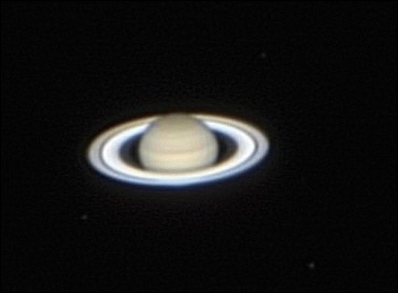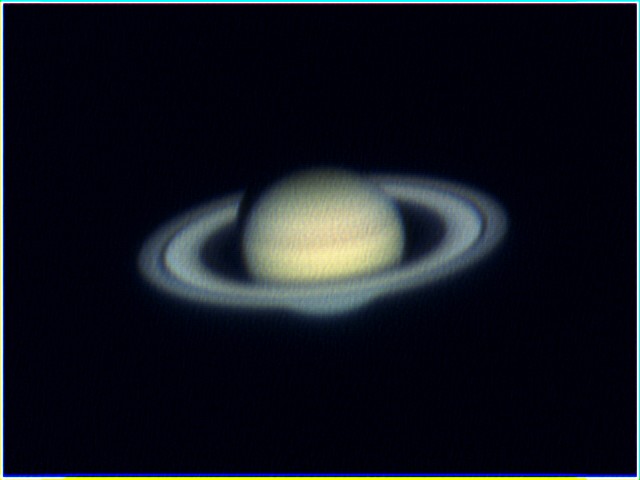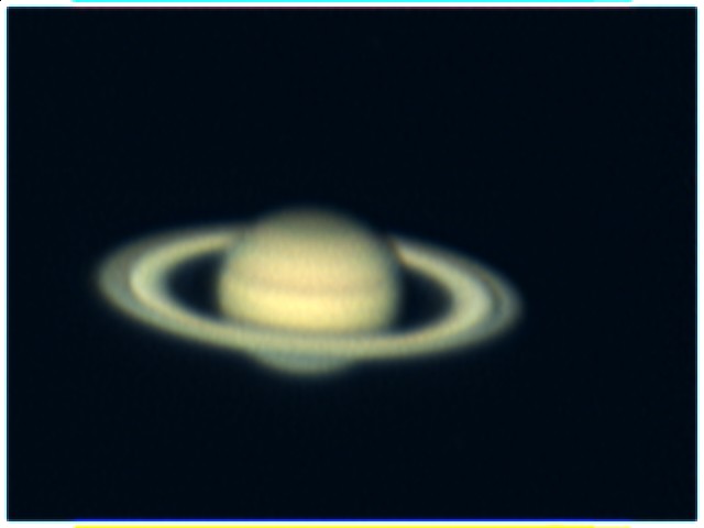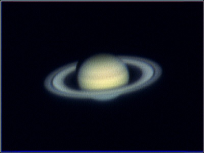 Saturn Aufgenommen mit der Philips Web Cam ToU Cam Pro II, durch das 10" LX200 GPS mit einer 2,5x Barlow, mit einer Brennweite von 6250mm. 2000 Bilder mit Registax aufaddiert.